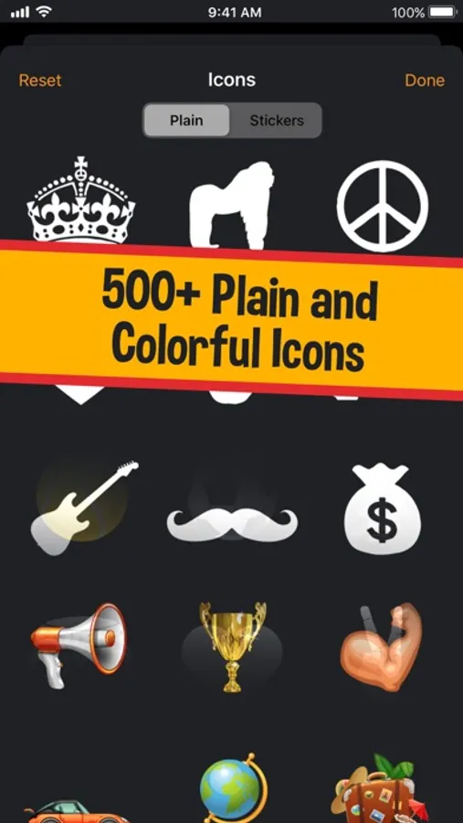 ⁃ Change the crown to a different icon by tapping it: hundreds of icons are included