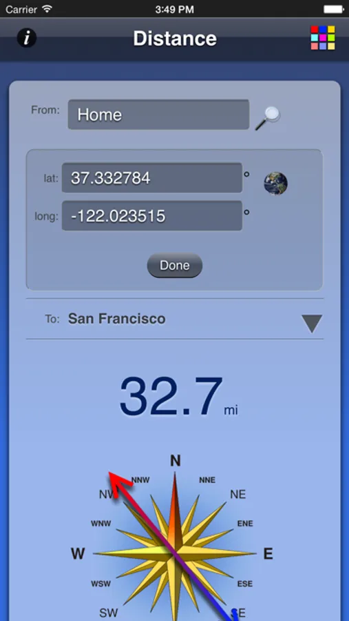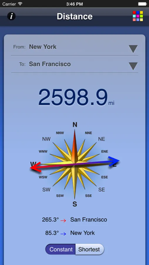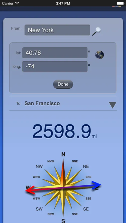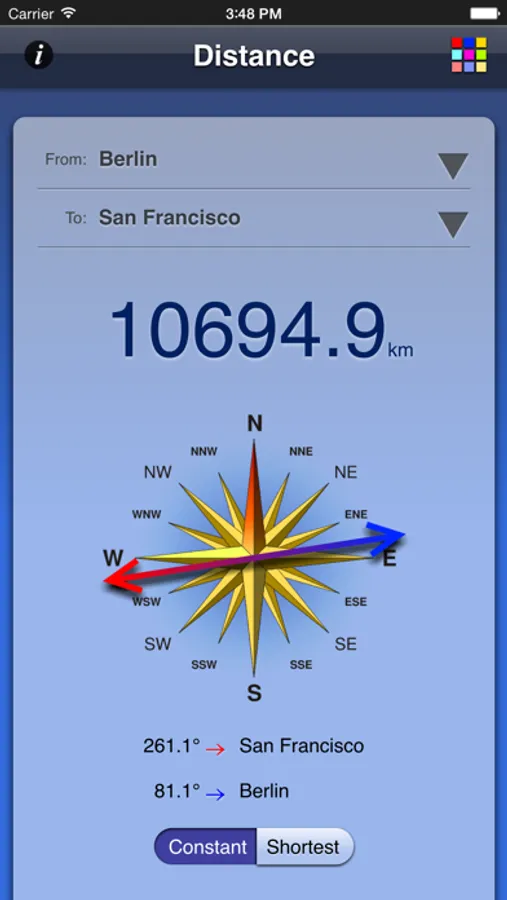- it calculates the shortest distance (on an orthodrome) or the distance with constant bearing (rhumb line or loxodrome) which you would follow by using a compass