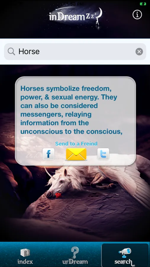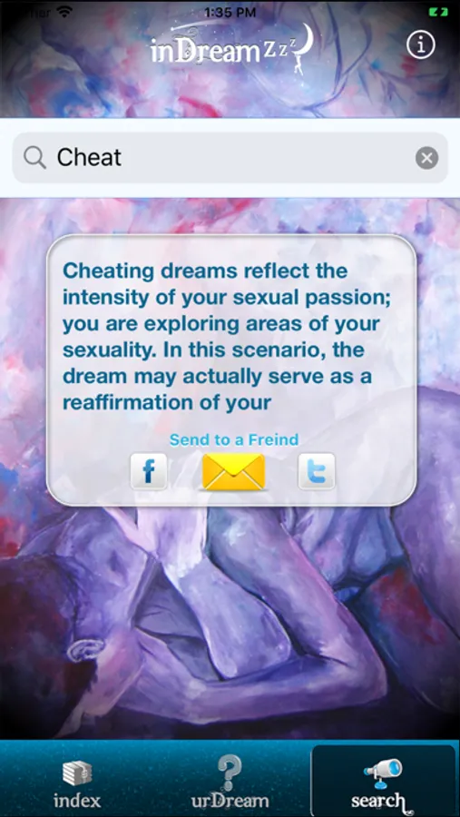 InDreamZzz app is a unique and dynamic app, lets you effortlessly keep a record of what you search for. Based on your Dreams, InDreamZzz recommends you to use more “UrDream” (An online Interpretations and human based).