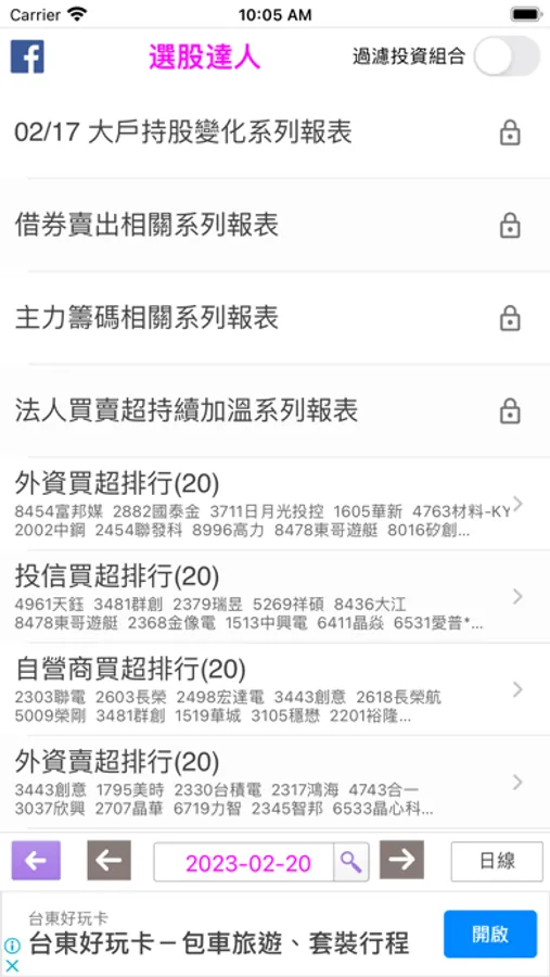 #「選股達人」可切換是否只顯示存在於「投資組合」中的關注商品。每日提供自製選股報告,包括三大法人賣賣超排行、三大法人同步買賣超、股價收新高、股價收新低、KD黃金交叉、KD死亡交叉、股價突破均線、股價跌破均線、含玉線、大陽線、倒鎚線、紡鎚線、鎚子線、紅三兵、黑三鴉、天劍線、墓碑線、十字夜星、跳空一字線、突破均線糾結。另每週提供大戶持股變化趨勢選股報告:1.大戶連續三週買賣、2.大戶轉買為賣、3.大戶轉賣為買。