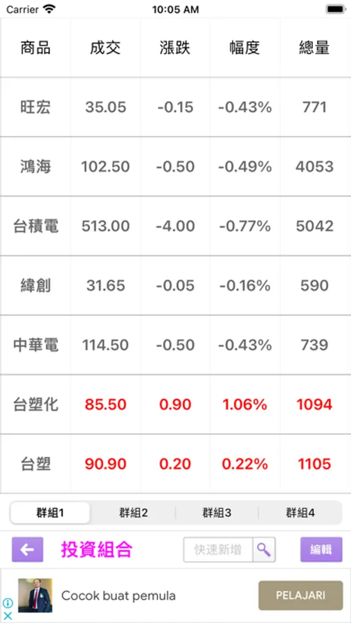 #「投資組合」讓使用者新增關注的商品組合,並可區分為四個群組,方便在「選股達人」、「大單進出」兩個功能中,將存在於「投資組合」中的關注商品過濾出來。