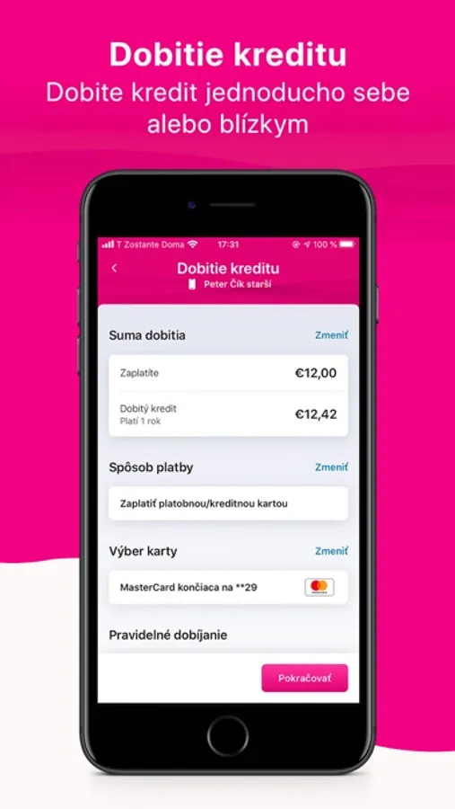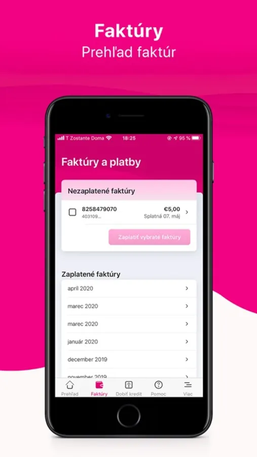 Aplikácia Telekom umožňuje jednoducho a pohodlne spravovať produkty od Telekomu. Pre mobilné telefónne čísla uvidíte koľko dát, minút a SMS ešte môžete v danom mesiaci využiť. Môžete si dokúpiť dátové balíčky na použitie doma a v roamingu. Do aplikácie si môžete pridať aj produkty pevnej siete (Magio Internet, Magio Televíziu, pevnú linku) alebo ďalšie telefónne čísla, aby ste mali pokope všetky vaše produkty, produkty blízkych a pod. Platenie faktúr je vďaka možnosti si uložiť si kartu veľmi rýchle.