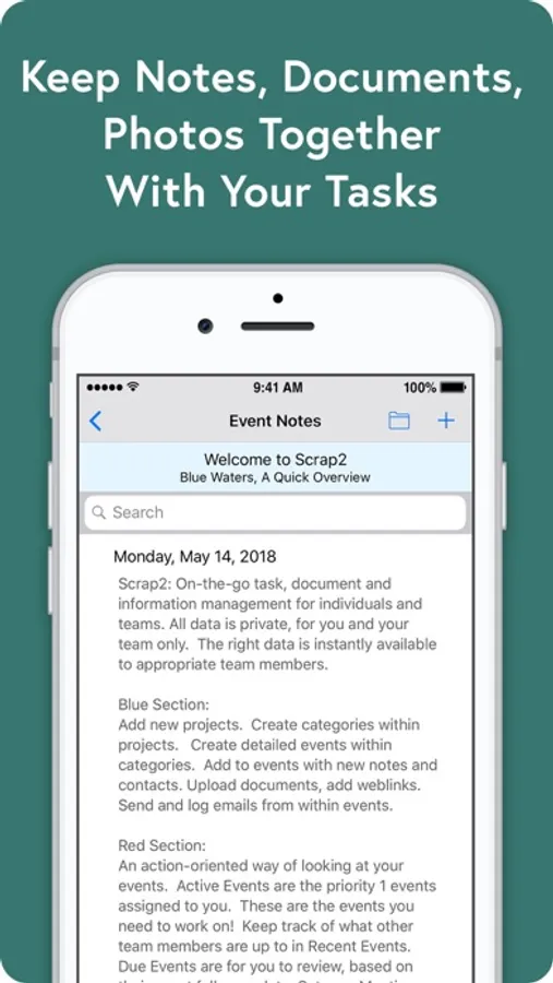 Project management support for individuals and teams. For projects, from small and simple to large and complex. Let Scrap2 remember what you need to get done - and when - so you don't have to worry about it. And when it is time to cruise through your list: relevant notes, contacts, documents and web links will be right there waiting for you.