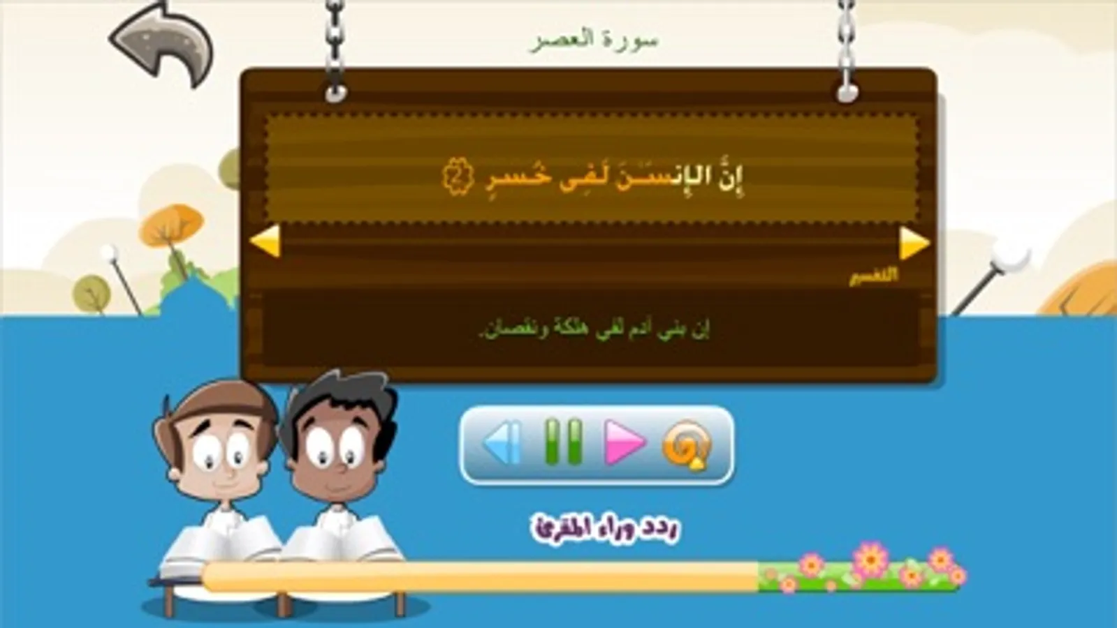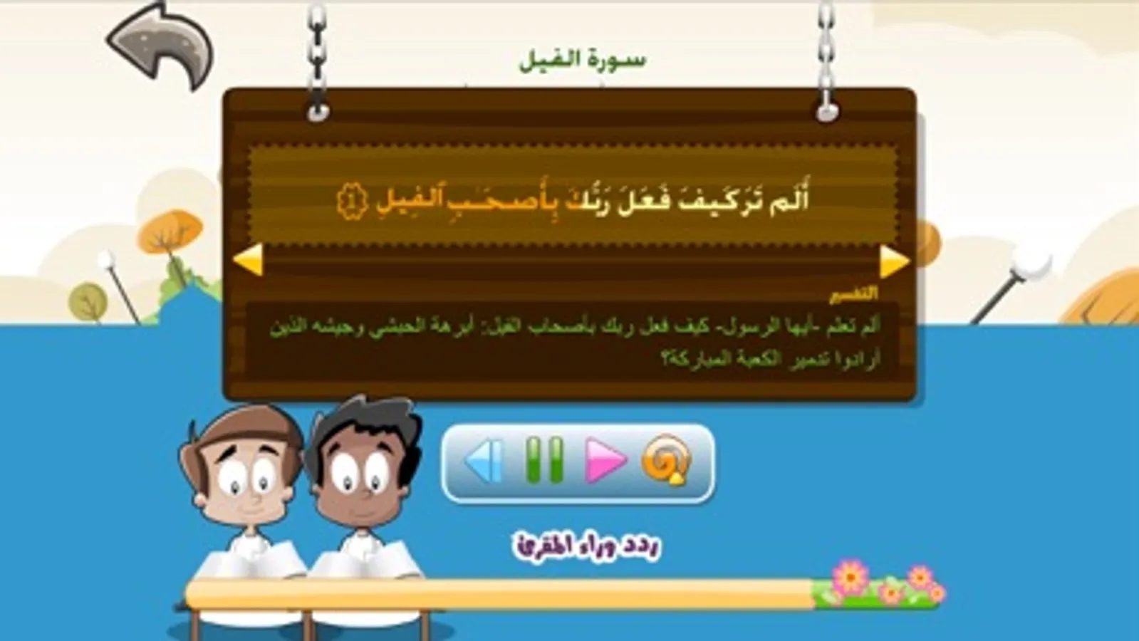 يقوم البرنامج بقراءة الايات اية اية من كل سورة بصوت الشيخ محمد صديق المنشاوي رحمه الله ثم يعاد قراءة الاية بصوت مجموعة من الاطفال الصغار للنساعد الاطفال على سهولة الحفظ و اعطائهم الجو المناسب و البيئة السلسة من اجل سهولة الفهم و الحفظ