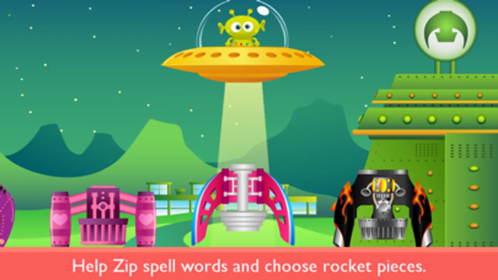 Kids join Zip the alien on an out-of-this-world spelling adventure to build a new rocket ship. They'll spell words to help him fly to 3 different planets and collect the rocket pieces he needs. The game ends when they launch their fancy new rocket into space and steer it through a short star-collecting mini-game.