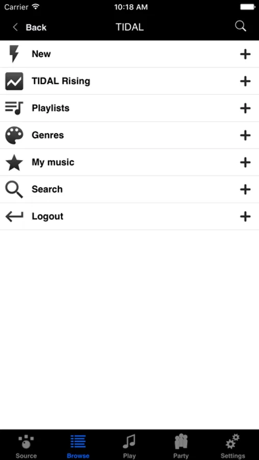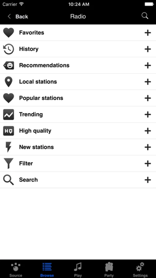 In combination with latest device firmware, m:app allows to control all supported sources (Internet Radio, Airable, Tidal, Qobuz, UPnP, USB, iPod, line in, etc.). It is easily possible to browse the sources and start and control playback of audio contents (where control of playback means play, pause, stop, fast forward, fast rewind, next/previous track, volume control as well as setting shuffle and repeat options). Album art is supported for Internet Radio, Podcasts, Tidal, Qobuz and UPnP in browse view as well as in play view (if original source supports/provides album art; album art behavior in browse view can be adjusted in app settings). Adding tracks to Presets is possible from browse as well as play view.