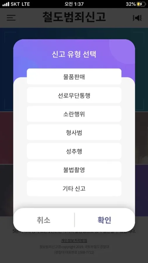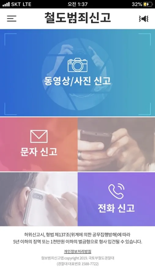 KTX, 전동열차, 철도역 등 철도지역 내에서 발생하는 범죄, 사건, 민원을 신고할 수 있는 서비스입니다.