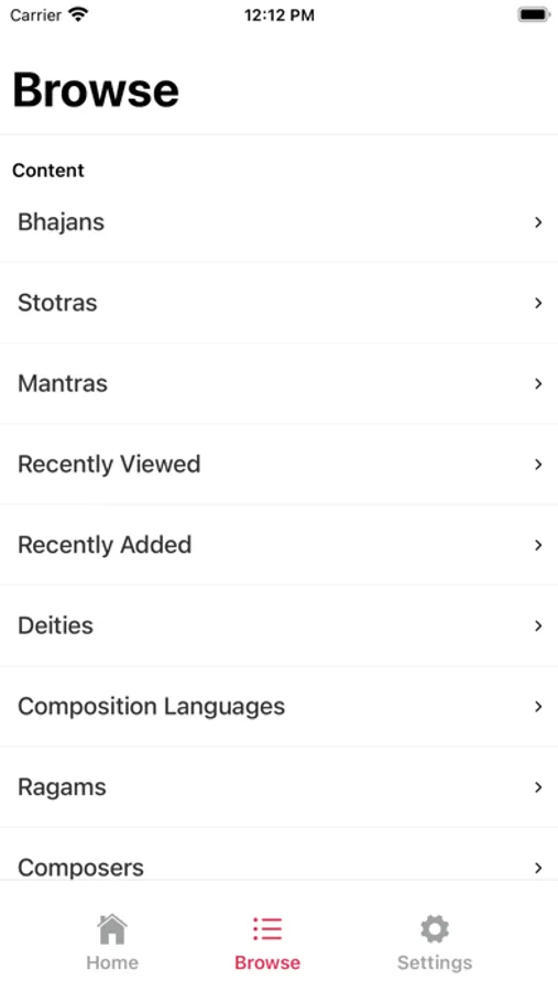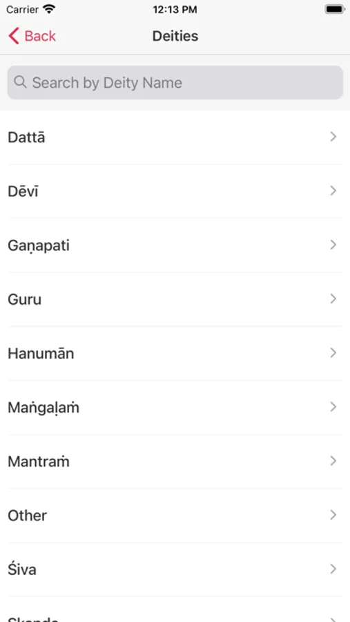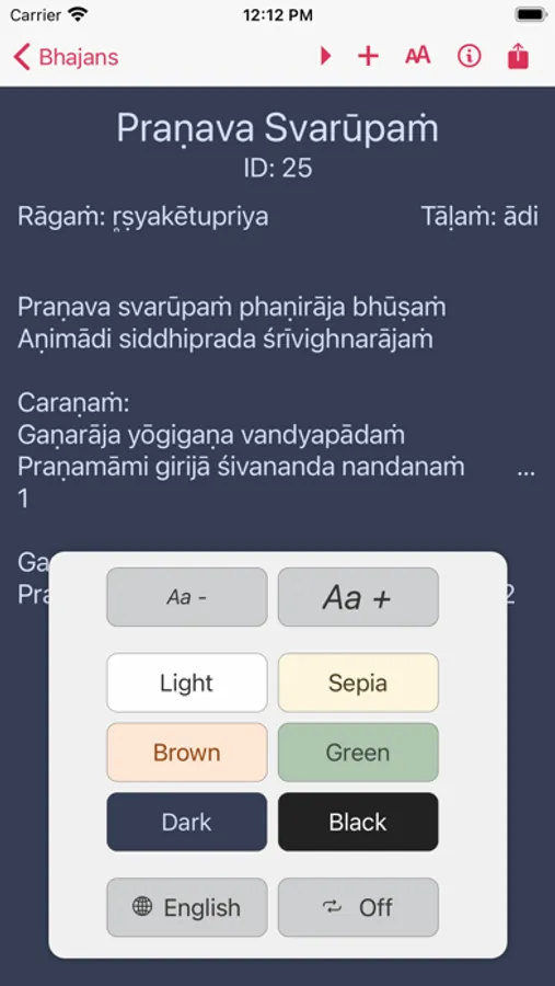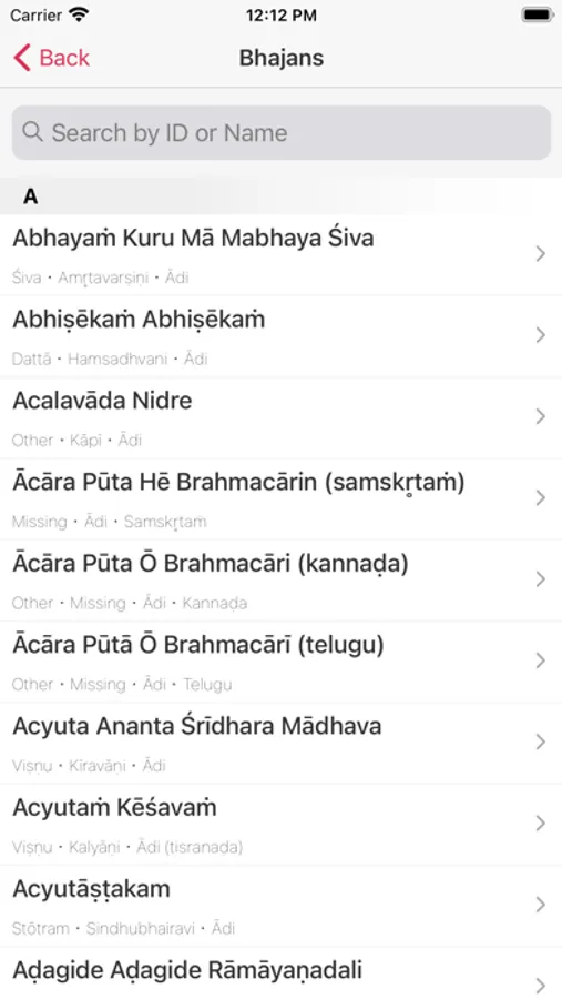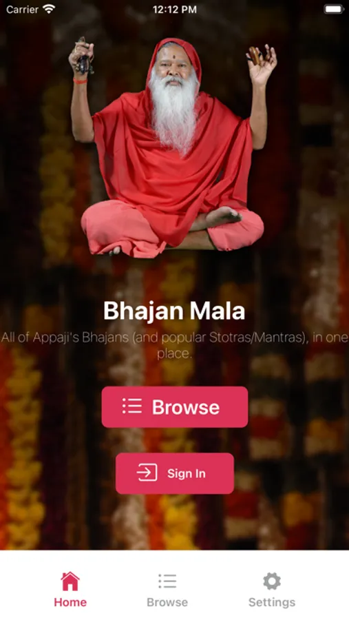 The app is preloaded with all lyrics of bhajans composed by Sri Swamiji and Jayalakshmi Mata, His mother and Guru. You can browse the bhajan list by deity or album. If you already have the audio track on your device, it starts playing and highlights the word in karaoke style. It gives a easy Buy button to itunes for those albums not on your device.
