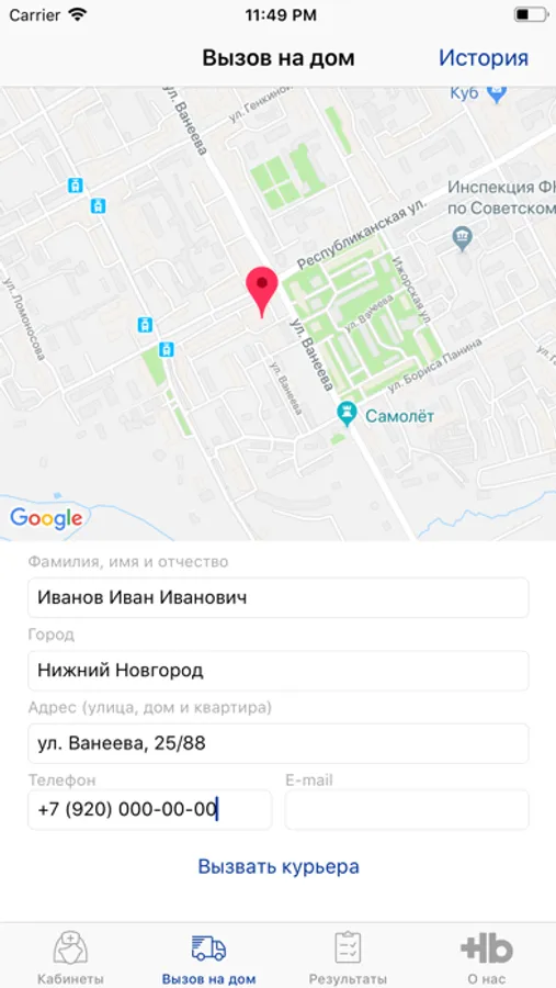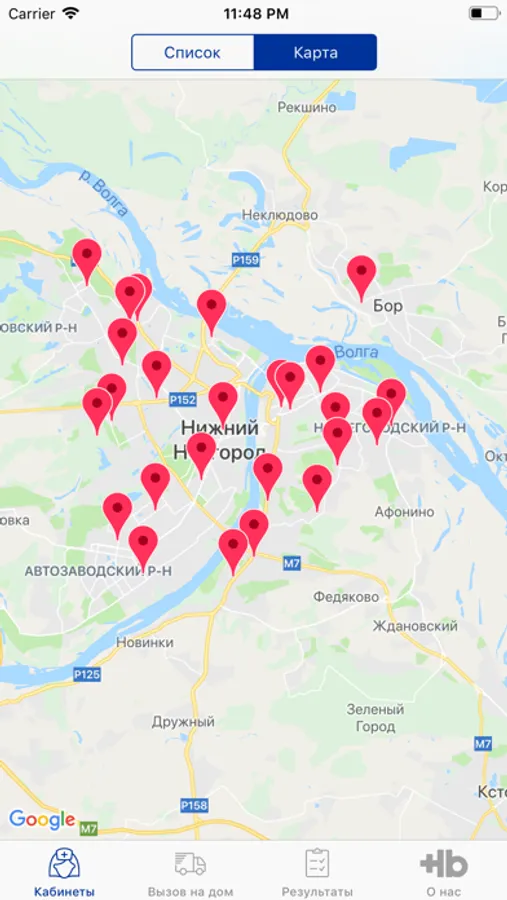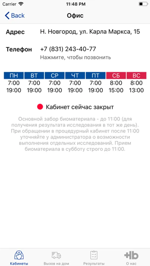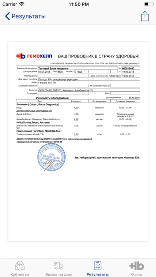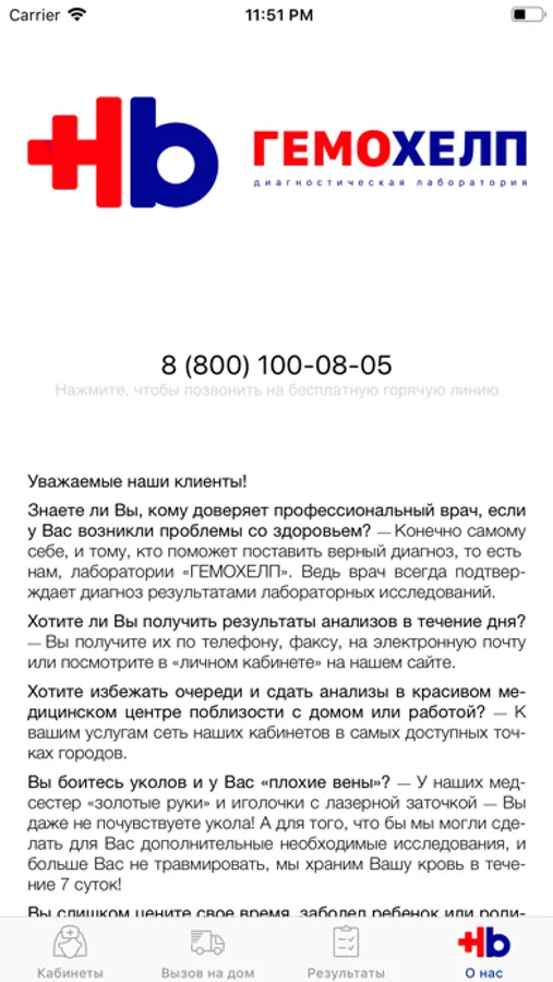 Приложение от сети диагностических клиник «Гемохелп» позволяет найти ближайший кабинет и узнать расписание его работы, просмотреть результаты анализов и сохранить их на свой телефон.