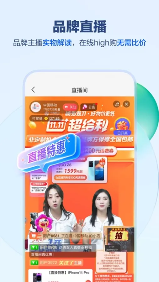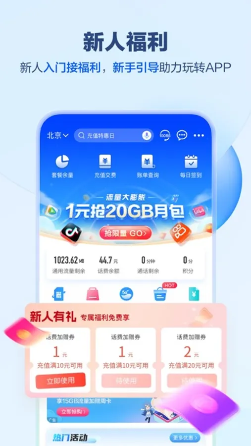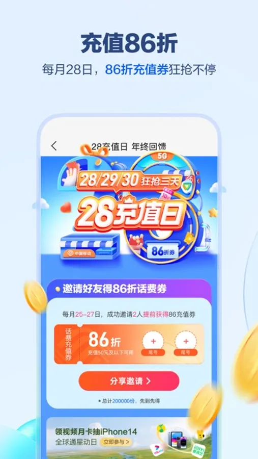 APP服务用户覆盖中国移动31省全量用户,为31省用户提供统一线上服务能力:查询缴费、业务办理、权益订购、积分商城、探索生活、视频客服等,满足中国移动用户丰富需求,为中国移动用户提供更便捷、更丰富、更个性化、更有趣的线上服务与移动“心”体验!