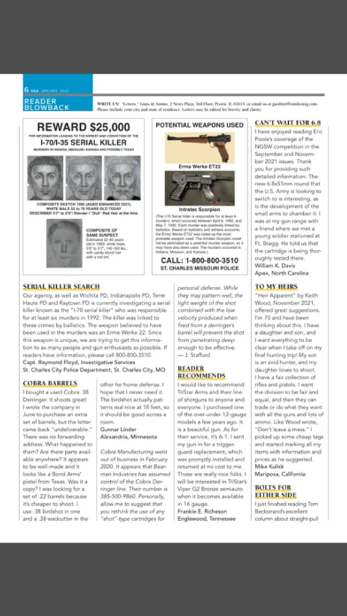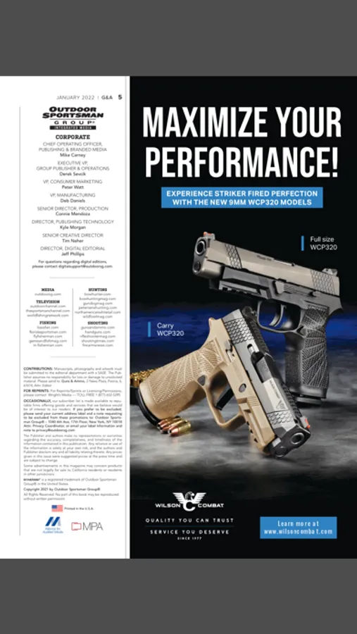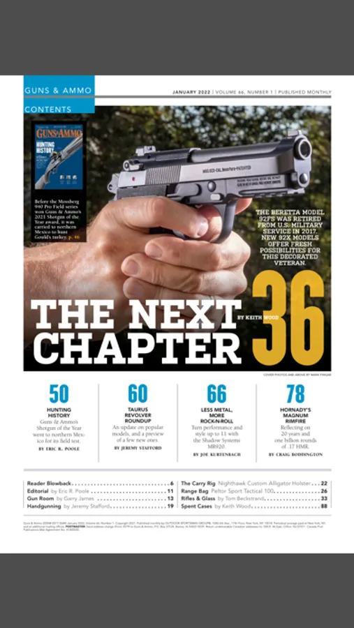 Since 1958, Guns & Ammo has been the leading authority in presenting new rifles, pistols, shotguns, optics, suppressors and ammunition. Columns include a monthly identification and values, long-term holster evaluations, the latest in firearm technology as well as discussions on gun trends and training. Editors and contributors are sourced from the most experienced and well written authors with backgrounds ranging from military combat experience to law enforcement to ballistic science and competition. With each article, readers can enjoy easy-to-read narratives and reviews supported by the highest quality photography making G&A the world's most widely read firearms magazine.