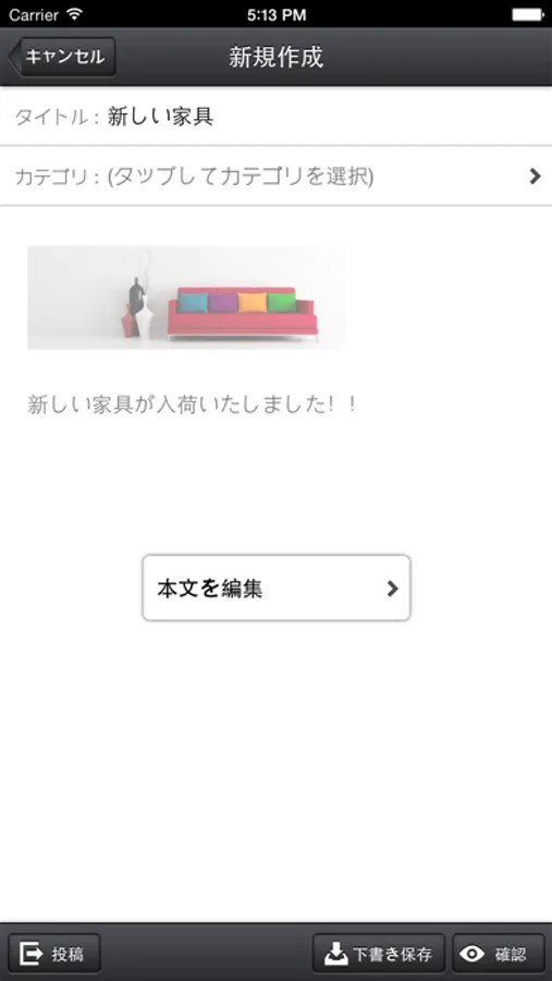 記事を作成する際に、カテゴリの設定、画像やカメラで撮影した複数の写真の掲載、写真とテキストを自由にレイアウトする等を簡単に行うことができます。