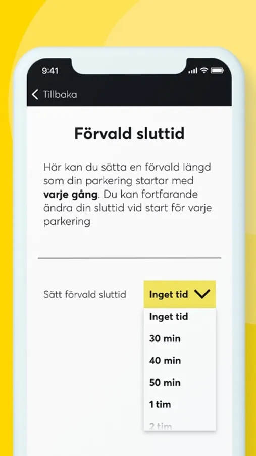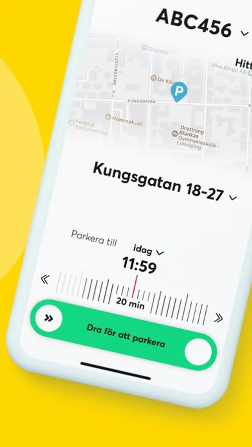 Du betalar din parkering via appen och slipper gå till automaten på utomhusparkeringar och gator. Du startar din parkering genom att välja en preliminär sluttid och sedan dra i reglaget för att starta.