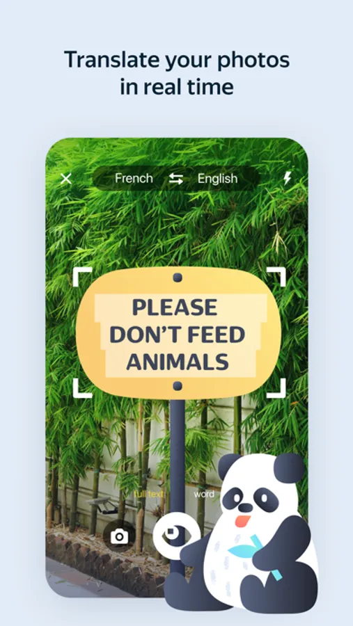 • Take a picture of a menu, road sign, book page or choose a photo with text from your Camera Roll to view its translation right over the image (only available when you are online).