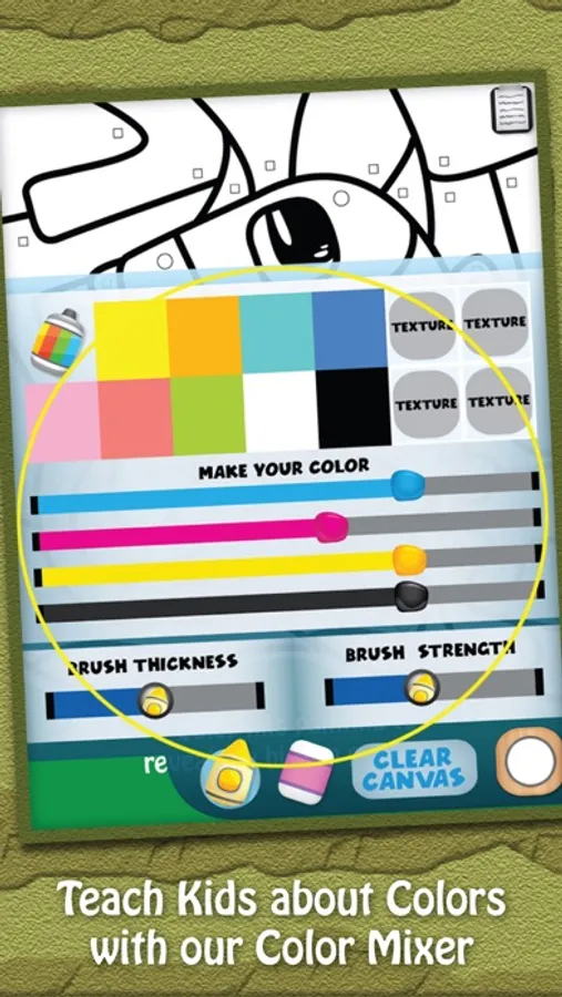 The key art tools & learning activities in our coloring book for kids are the Color Mixer and Texture Brush.