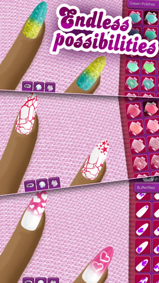 * Unlock more patterns, stickers, rings, rhinestones and nail polish colors!