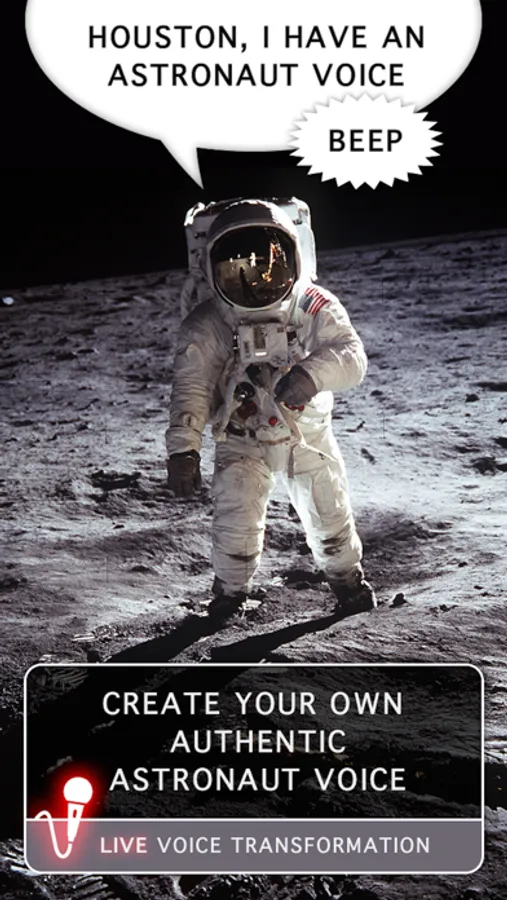 Transform your voice live into a real Apollo astronaut's voice! With live mode, groundcontrol/astronaut switch, the famous roger beep, special effects such as rocket motor, alarm, thrusters, airlock and original Apollo mission video material.