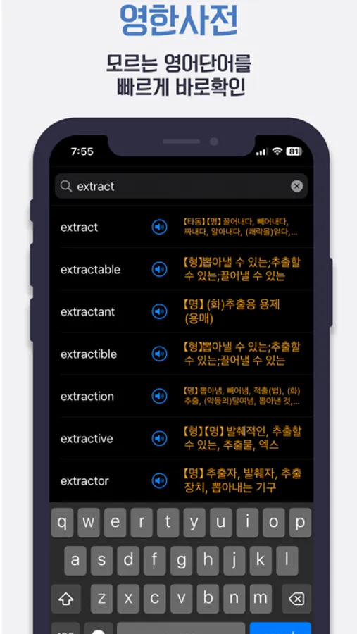 - 입력한 문자가 포함된 단어의 리스트를 보여주어 철자를 모르는 단어도 쉽게 찾을수 있습니다.