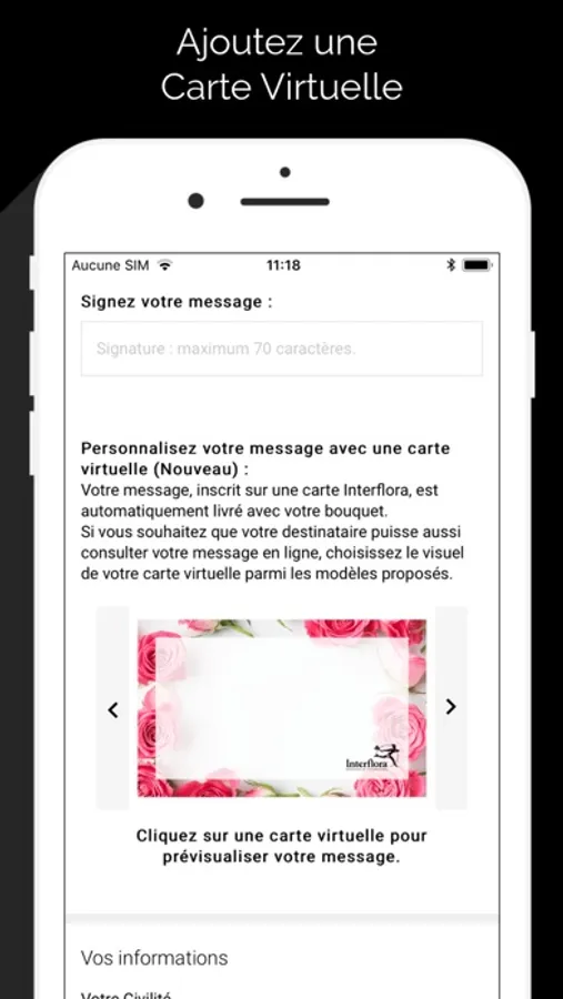 - « Message virtuel » : joignez à votre bouquet une carte message virtuelle que le destinataire de votre bouquet pourra consulter en ligne.