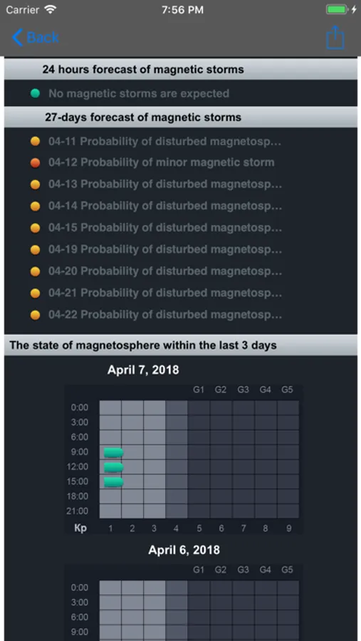 In application also you can see detailed magnetosphere state forecasts, for 24 hours and following 27 days. You can receive push notifications of distrubed magnetosphere.
