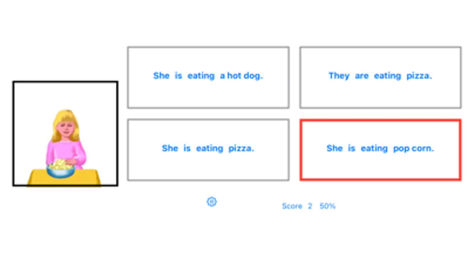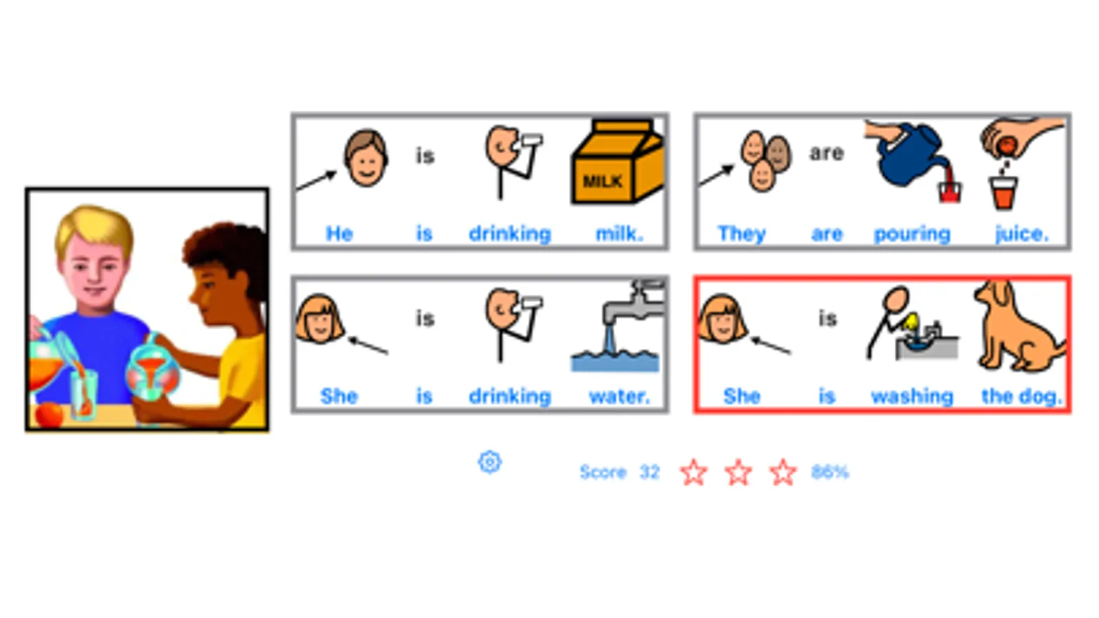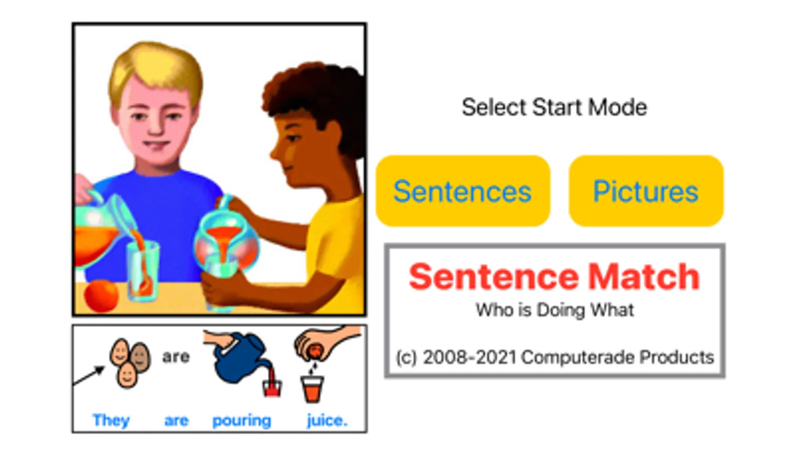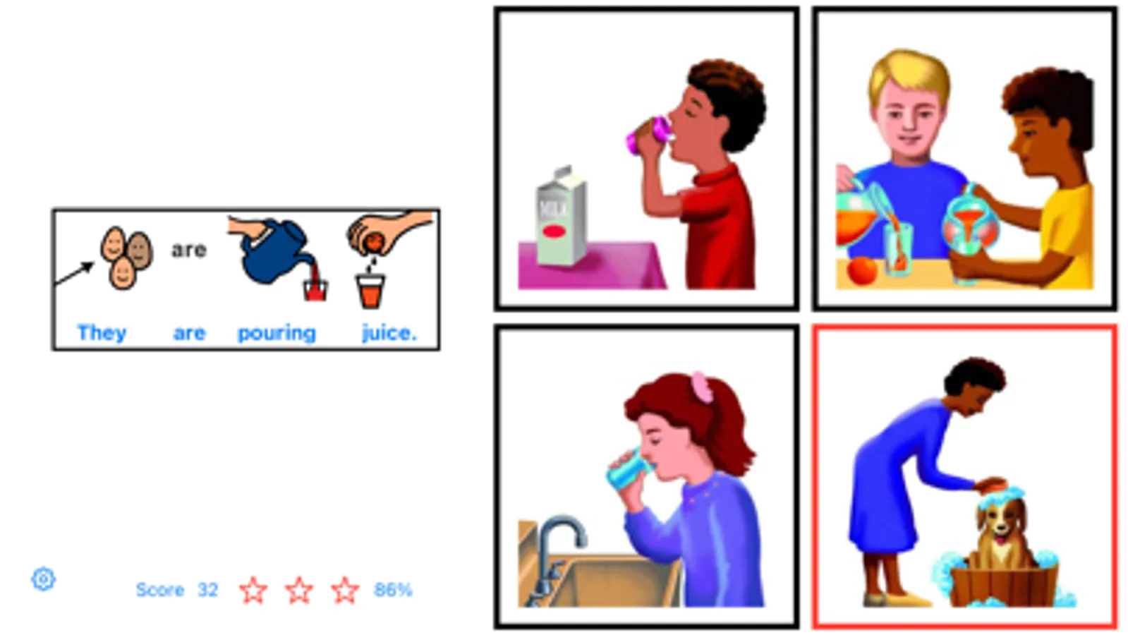 Learn to connect meaning with sentences. Choose from 4 sentences to match the picture or, choose from 4 pictures to match the sentence. Sentences can be displayed as text and/or PCS symbols at 3 difficulty levels. Animation with speech feedback reinforces the correct match. Score shows % and number correct. Adults can easily set difficulty level and other options.