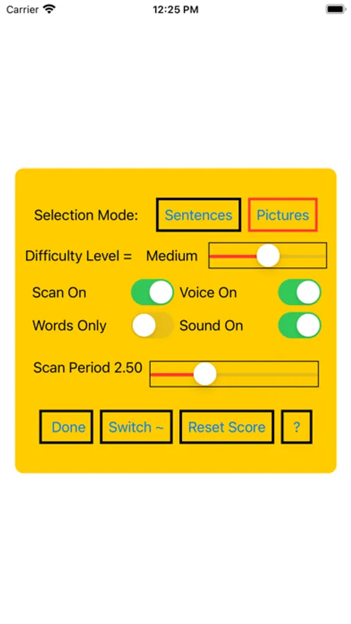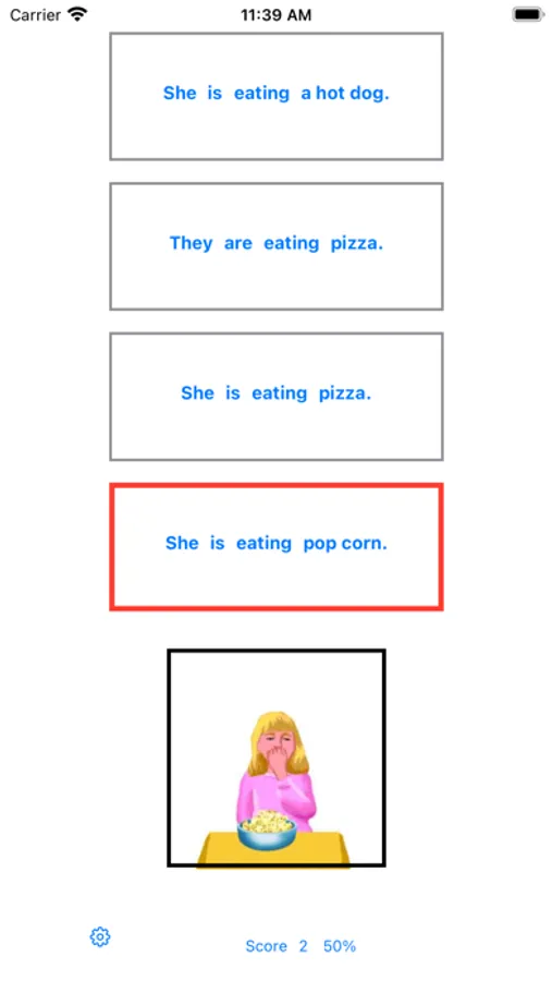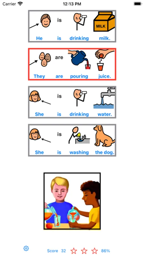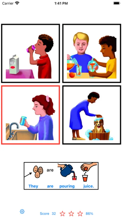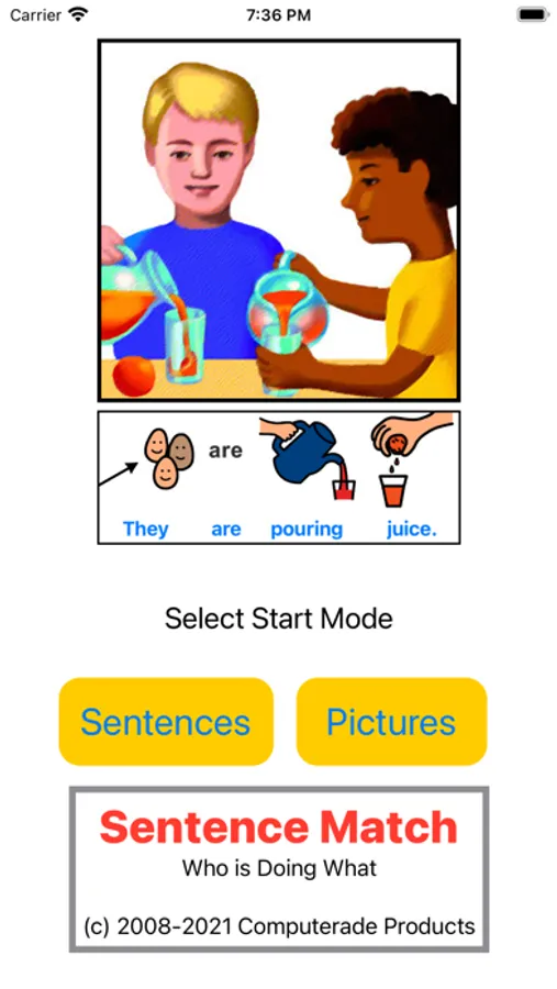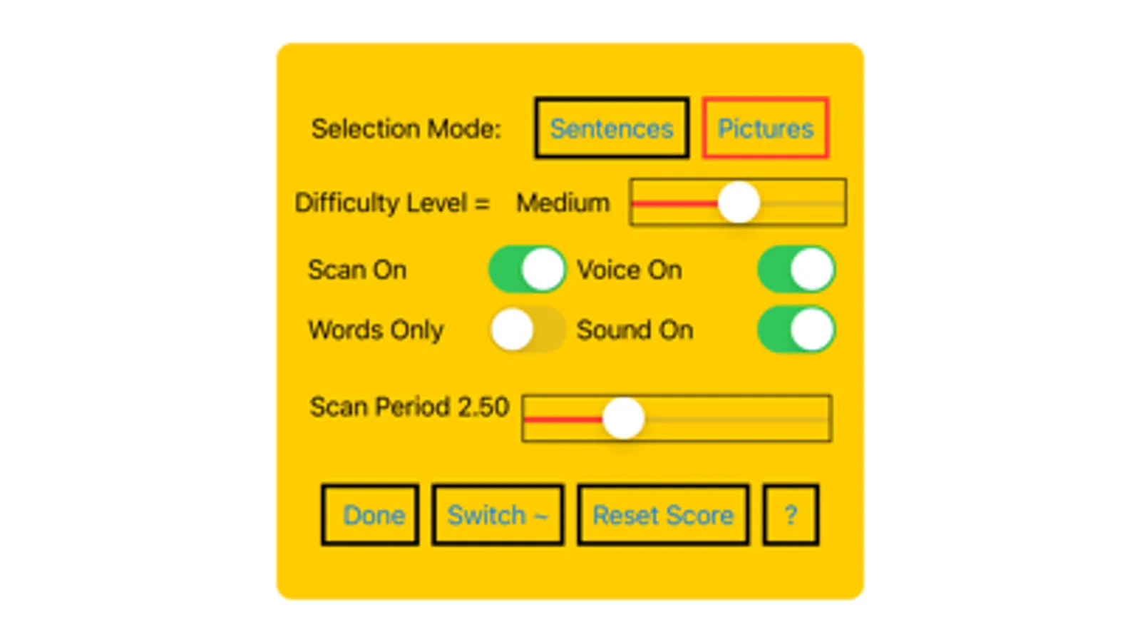 Learn to connect meaning with sentences. Choose from 4 sentences to match the picture or, choose from 4 pictures to match the sentence. Sentences can be displayed as text and/or PCS symbols at 3 difficulty levels. Animation with speech feedback reinforces the correct match. Score shows % and number correct. Adults can easily set difficulty level and other options.
