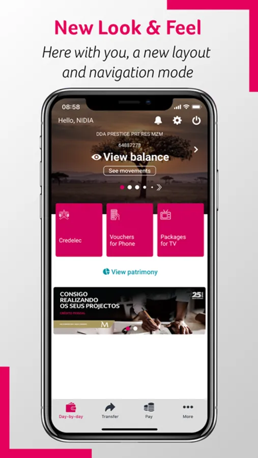 The new Smart IZI layout offers you a different navigation mode from the previous one. Now, after logging in, you can slide to the left or right on the products carousel and have an overview of all your products: accounts, cards, savings and loans. To make it even easier to navigate through the App, the new version of Smart IZI has a fixed navigation bar at the bottom of the screen where you can quickly access to "day-by-day", "transfer", " pay" and "more".