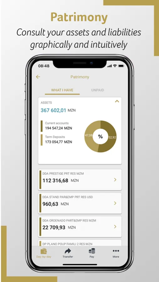 You will be able to view your assets and liabilities in a graphic and intuitive way, just by clicking on the Patrimony button right below the product carousel.