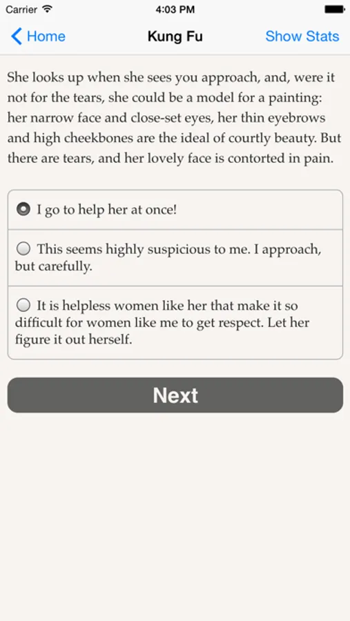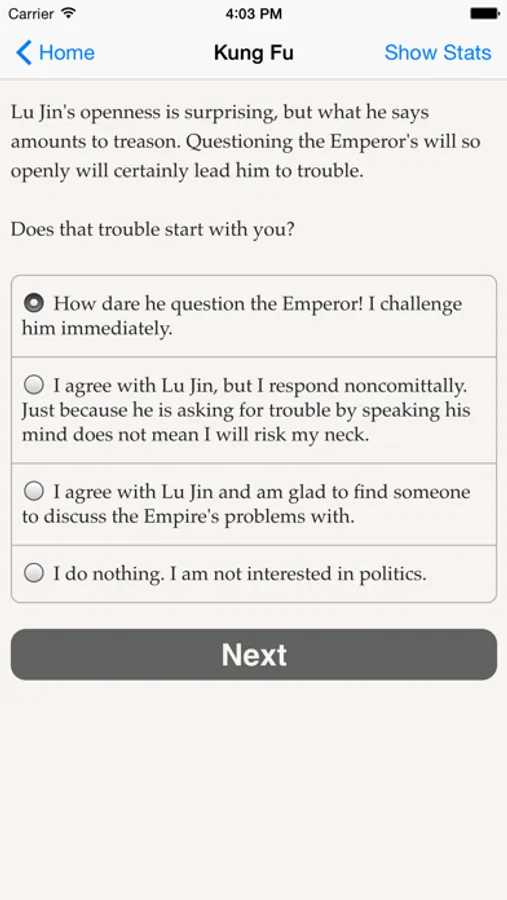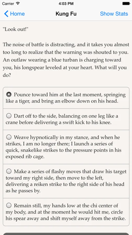 "Choice of Kung Fu" is a fast-paced interactive fantasy novel where your choices determine how the story proceeds. The game is entirely text-based—without graphics or sound effects—but powered by the vast, unstoppable power of your imagination.