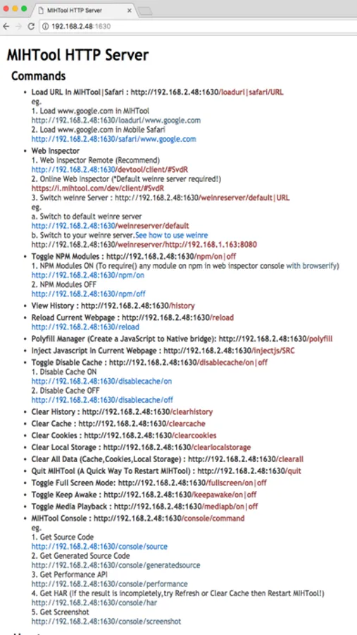 4.Remote control (With HTTP Server): Remote to, Load URL in MIHTool|Safari|Chrome; Inject Javascript in current webpage; Clear website data; Get HAR data; Get source code; Get screenshots...