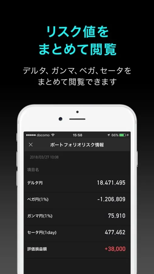 Greeks such as Delta, Gamma, Vega, etc. of portfolio basis can be displayed on "Portfolio risk function".