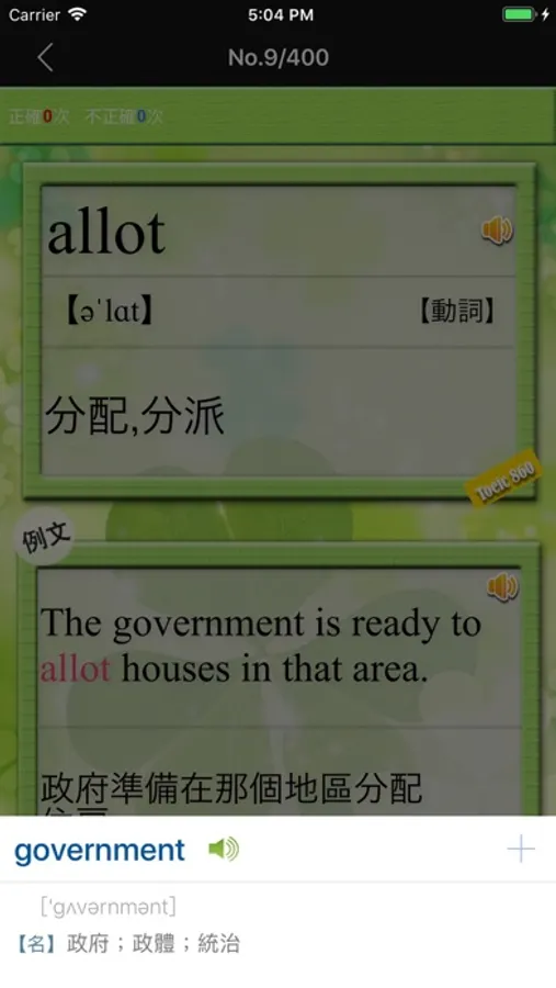 ・單詞卡片包含中英文對照,音標,詞性以及清晰的真人發音,並且每個單詞都有相應的中英文例句說明。