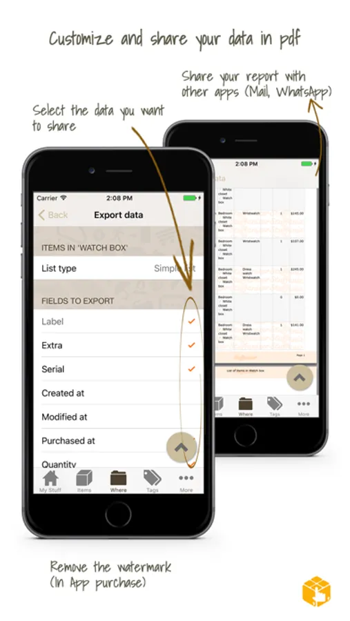 Within the export feature, you'll be able to generate a PDF with all your things, with or without images, selecting the fields and the type of list. You also can export to Excel (IAP)