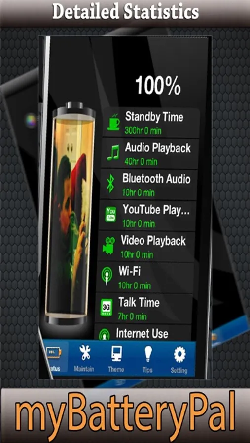 myBatteryPal allows you to see how much charge is remaining on your battery for 12 common tasks, such as video playback, talk time etc along with many customisable options such as;