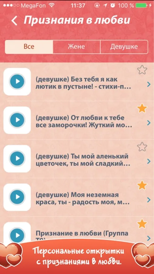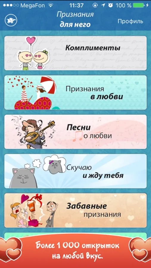 Приложение содержит большую коллекцию признаний в любви, что позволит каждому найти подходящую открытку. Классические признания, песни о любви, прикольные, музыкальные, комплименты и многое другое.