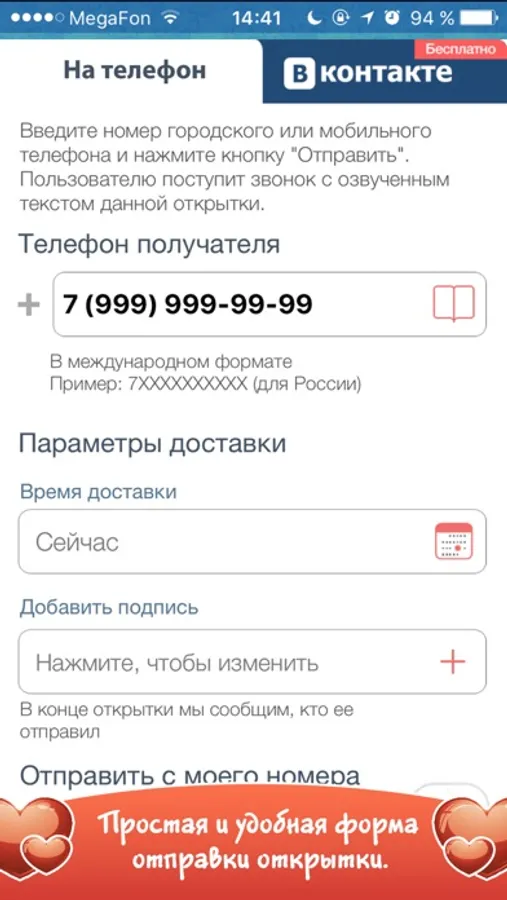 Ты можешь выбрать и прослушать любое из них, а затем, указав телефонный номер из записной книжки своего iPhone, отправить его получателю в любую страну мира. Адресат получит твое поздравление в виде звонка на мобильный телефон.