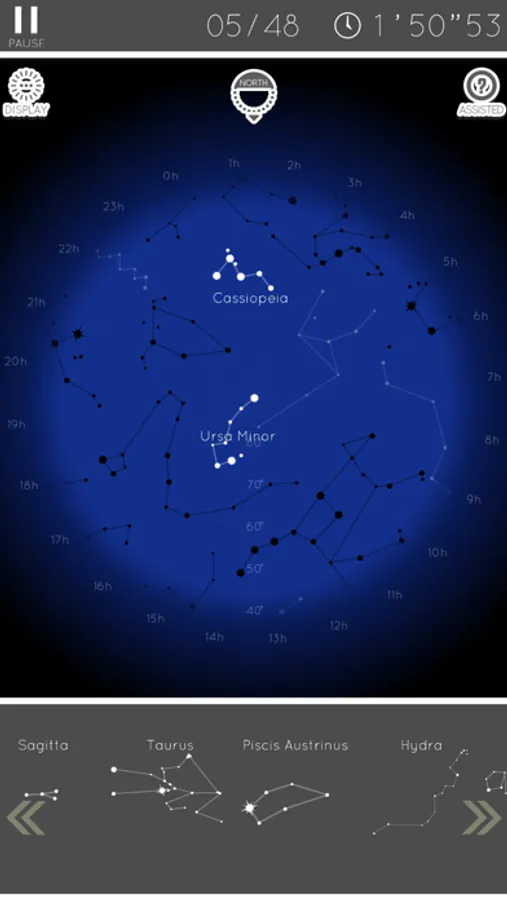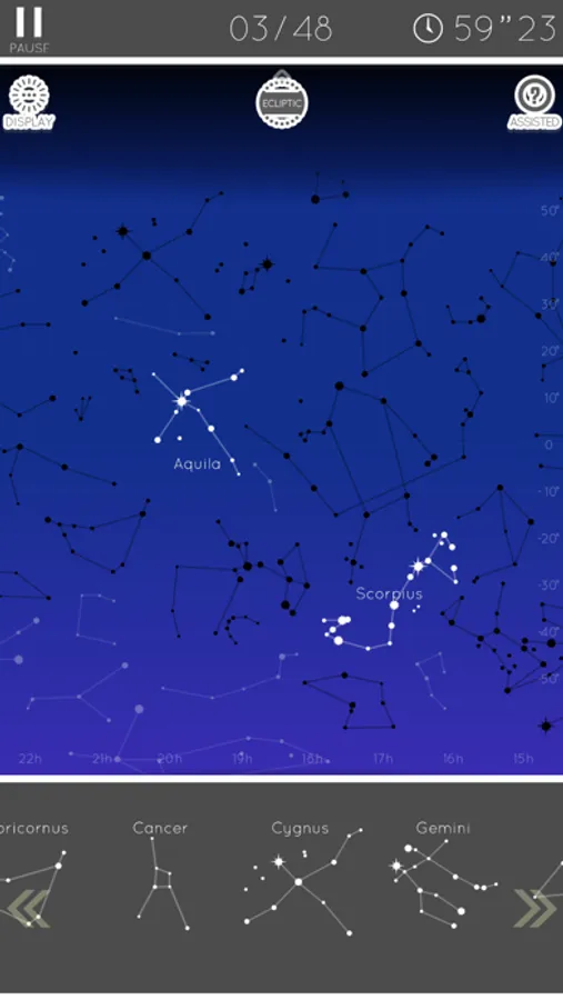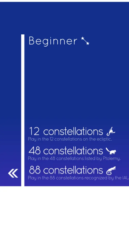 There are three modes available: one featuring 12 constellations on the ecliptic like Aries and Libra, which are also used in astrology; one featuring the 48 constellations listed by Ptolemy, such as Orion and Cassiopeia, which appear in ancient myth; and one featuring the 88 constellations recognized by the IAU.