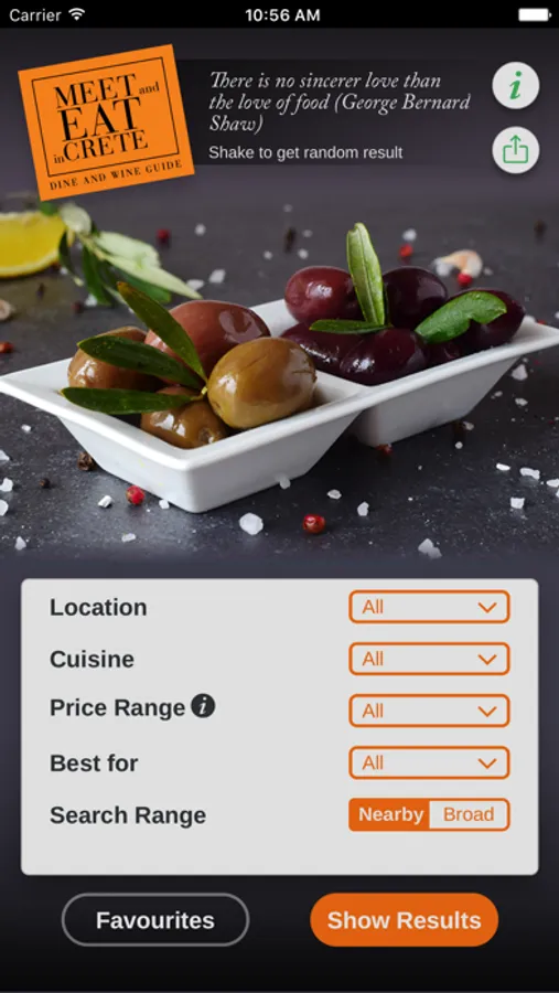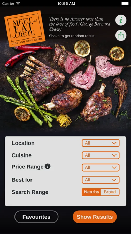 Can’t decide where to eat on the island of Crete? Meet and Eat in Crete Restaurant Finder can help you find exactly what you are looking for, exactly when you are looking for it. SHAKE and let us decide for you, or choose one of the places NEARBY your current location, or BROWSE our advanced search criteria to find just the right dining experience. Meet & Eat in Crete is user-friendly, intuitive and interactive and is brought to you by the professionals who publish the best-loved gastronomic guide since 2007.