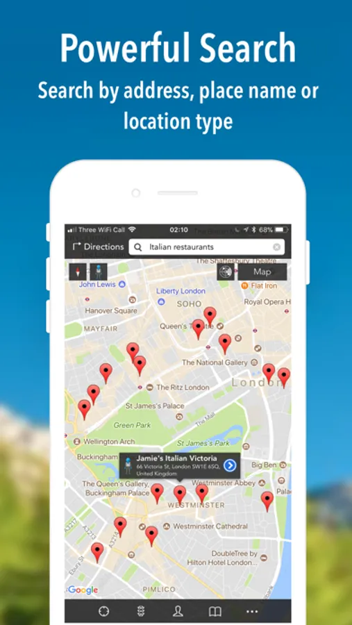 - Search by address or textual query (eg 'London, UK' or 'Restaurants in New York'). In addition, you can 'radar search' the visible map area to locate places of interest such as restaurants, pubs, ATMs and more.