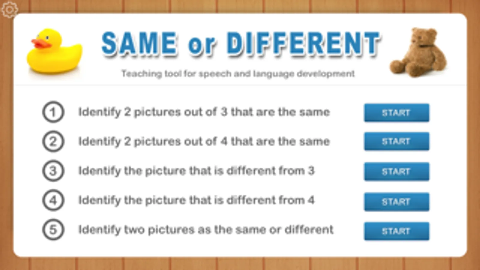 Understanding the concepts of “same and different” is an important skill for building stronger vocabulary, oral language, receptive language, visual perceptual skills and reading skills. Same or different recognition is an early form of classification. This app can help develop early visual perceptual skills including: discrimination and matching skills as well as building cognitive and language skills by teaching new concepts and categorization/classification.