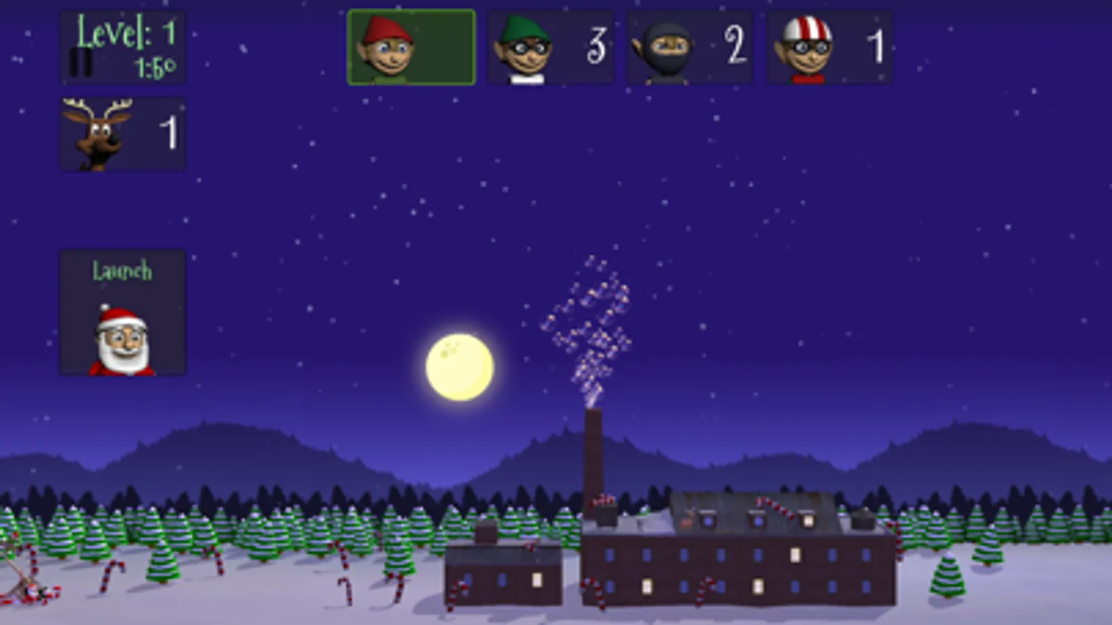 Help Santa shoot the elves from the catapult so they can land on the reindeer and return them to the stable.