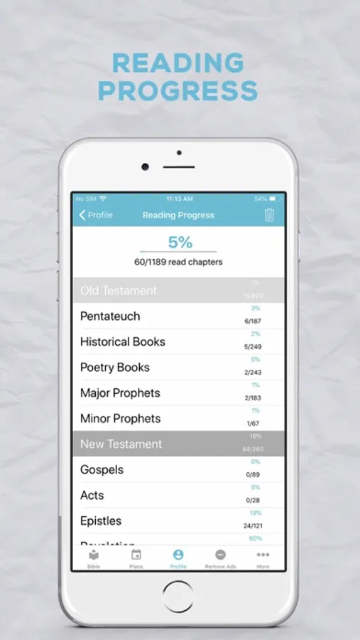 o Reading Progress: users can mark the chapters as "read" and can track the percentages of what they have read in relation to each book, the whole Bible, and the Old and New Testaments.