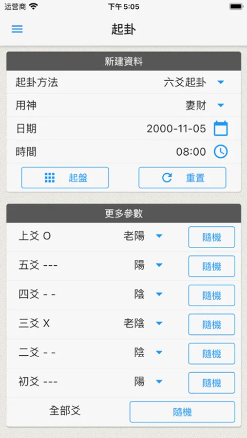 1. 支持时间,多种数字起卦,六爻,自定组合以及类象加方位等起卦方法。