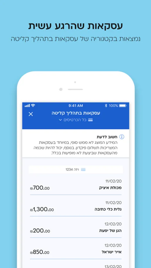 - מה תוכלו למצוא בפירוט העסקאות? את כל ההוצאות שלכם בארץ ובחו"ל, כולל כאלה שעשיתם ממש הרגע. ראיתם עסקה עם חיוב מוזר או ששם בית העסק לא מצלצל לכם מוכר? תהיו רגועים, אפשר למצוא באפליקציה את פרטי העסקה בקלות עד שנה וחצי אחורה.