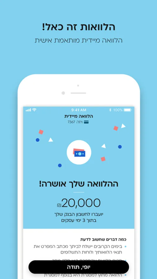 - צריכים הלוואה? הכנו באפליקציה תהליך פשוט ומהיר שבו תוכלו לבקש הלוואה מתי שתרצו.