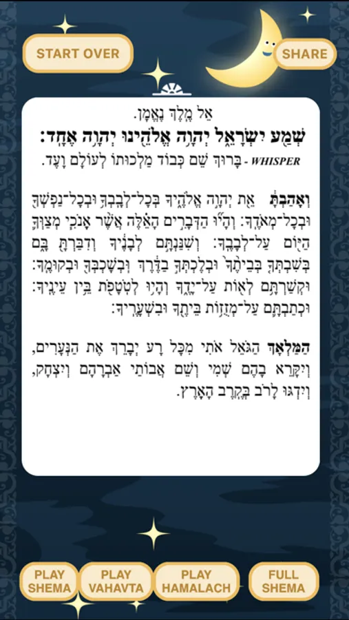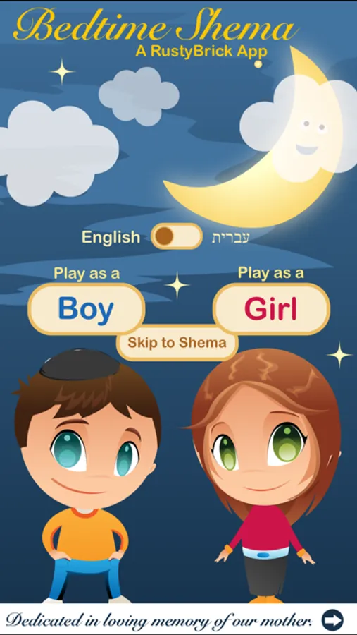 The Bedtime Shema app is a fun and interactive learning aid for Jewish children. The purpose of the app is to help children learn to say the Bedtime Shema, the קריאת שמע על המטה.