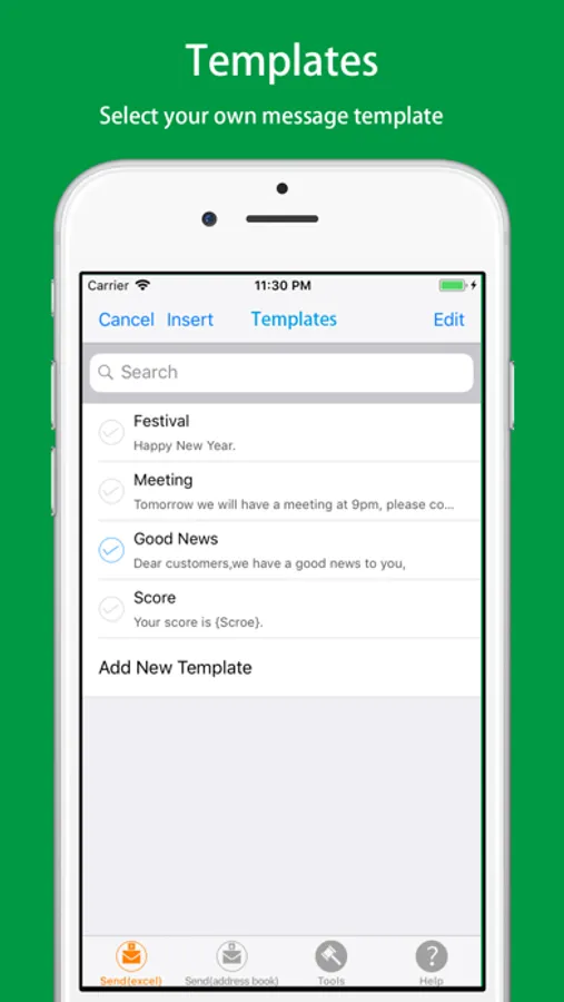 You can create an Excel file on the computer that contains the definition of personalized SMS content and receive numbers, and then uploaded to the iPhone via WiFi / iTunes, you can send personalized text messages to contacts in Excel. The Excel file must include the recipient number column which named "TEL", the other columns are optional. You can also export a sample file, edit the sample file and recipient information.