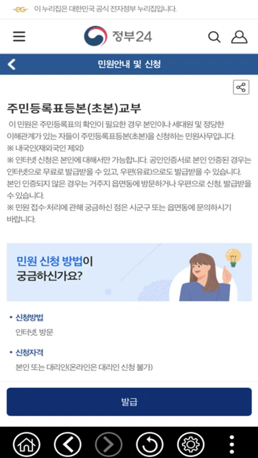 - 민원신청은 행정기관 방문 없이 언제, 어디서나 인터넷을 통해 필요한 민원을 안내받고 열람·신청·발급하는 서비스입니다.