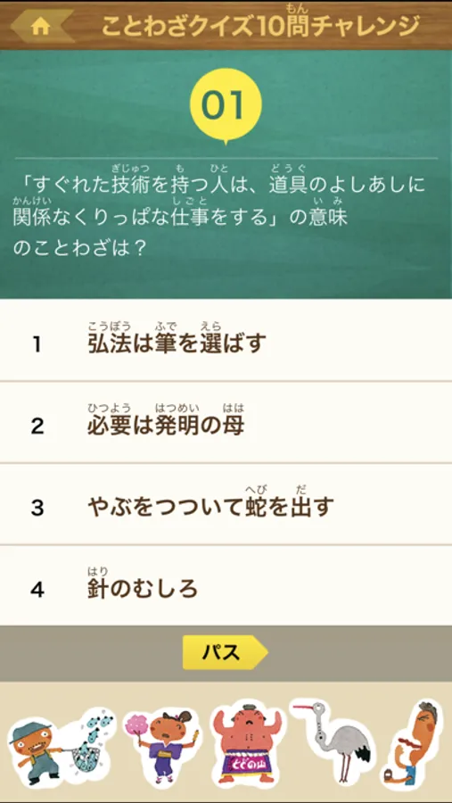 ●「ことわざクイズ」(全270問)では、間違えやすそうなことわざを4択クイズにしました。ことわざの意味を正確に覚えられているかチェックできます。