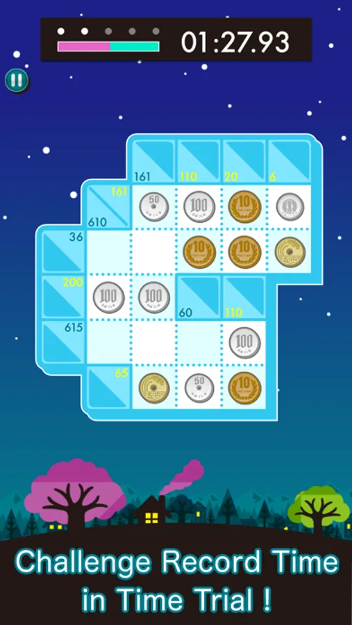 Drag and drop coins (1yen, 5yen, 10yen, 50yen, 100yen and 500yen) into the right cells to match the total amount in a row/column with the number on a hint cell.